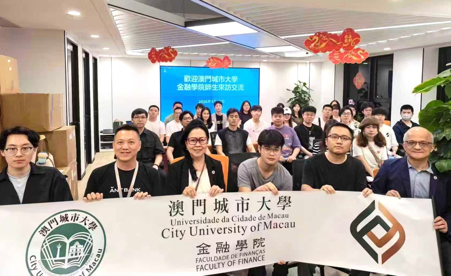 On March 31, 2026, to continuously promote industry-academia collaboration and facilitate the integration of theory and practice for students, master’s students from Faculty of Finance at City University of Macau visited Ant Bank (Macao) Limited for an exchange and learning session. Distinguished guests included Mr. Mio Cheng Yu, General Manager of Business Development Department of Ant Bank (Macao) Limited, and Mr. Cheong Weng Hou, Head of Securities Business in the Business Development Department, as well as Dean Adrian Cheung and Associate Dean Eva Khong of the Faculty of Finance.