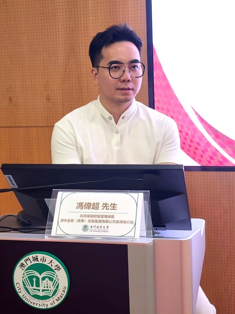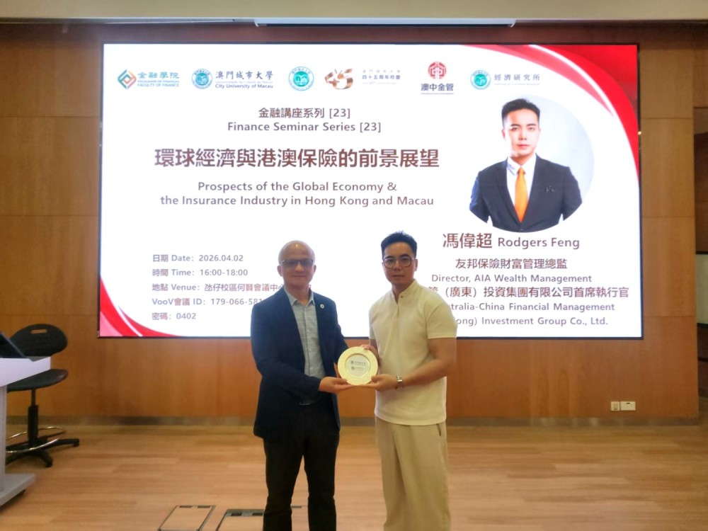 On April 2, 2026, the Faculty of Finance at City University of Macau held a finance seminar at Ho Yin Conference Center on Taipa Campus. The seminar featured Mr. Rodgers Feng, Director of AIA Wealth Management and CEO of Australia-China Financial Management (Guangdong) Investment Group Co., Ltd., was invited as the keynote speaker. The seminar focused on the theme "Prospects of the Global Economy & the Insurance Industry in Hong Kong and Macau". Distinguished guests included Dean Adrian Cheung and Associate Dean Eva Khong of the Faculty of Finance.
