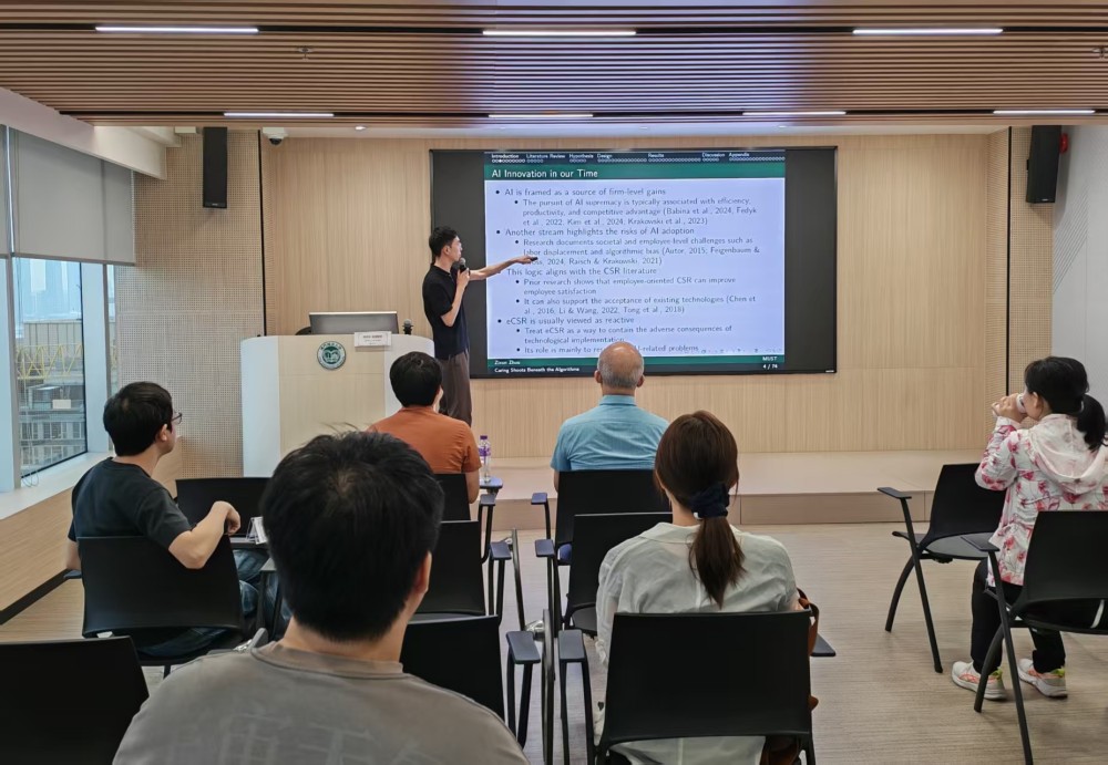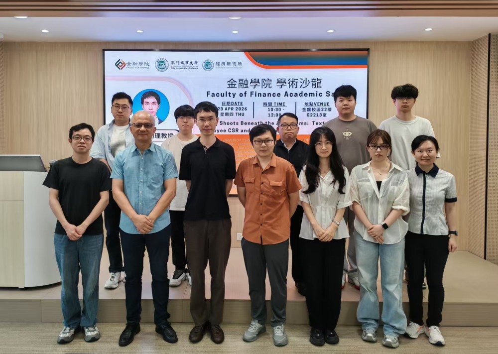 On 23 April 2026, the Faculty of Finance at the City University of Macau organized the fourteenth academic salon at the golden dragon campus. This academic salon invited Dr. Zixun Zhou, an assistant professor of Macau University of Science and Technology, as the speaker. He presented his paper titled “Caring Shoots Beneath the Algorithms: Text-based Employee CSR and AI innovation”.