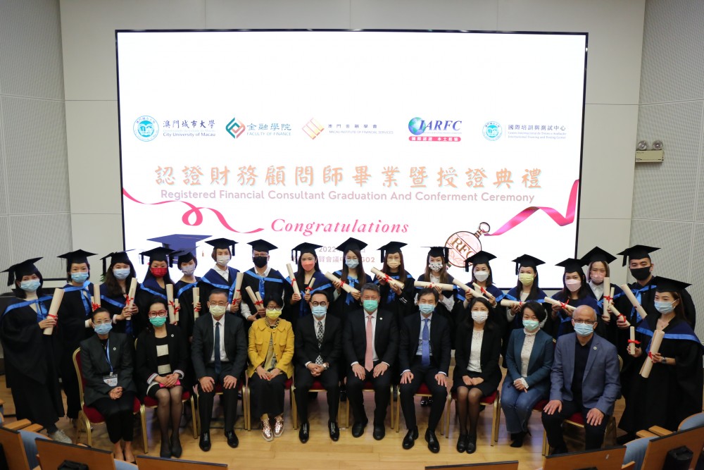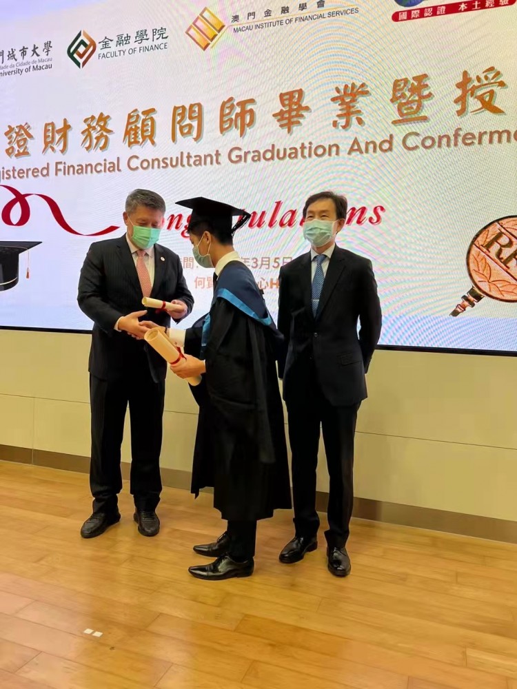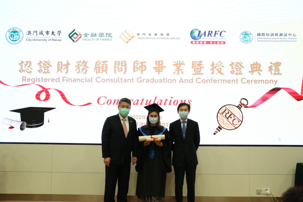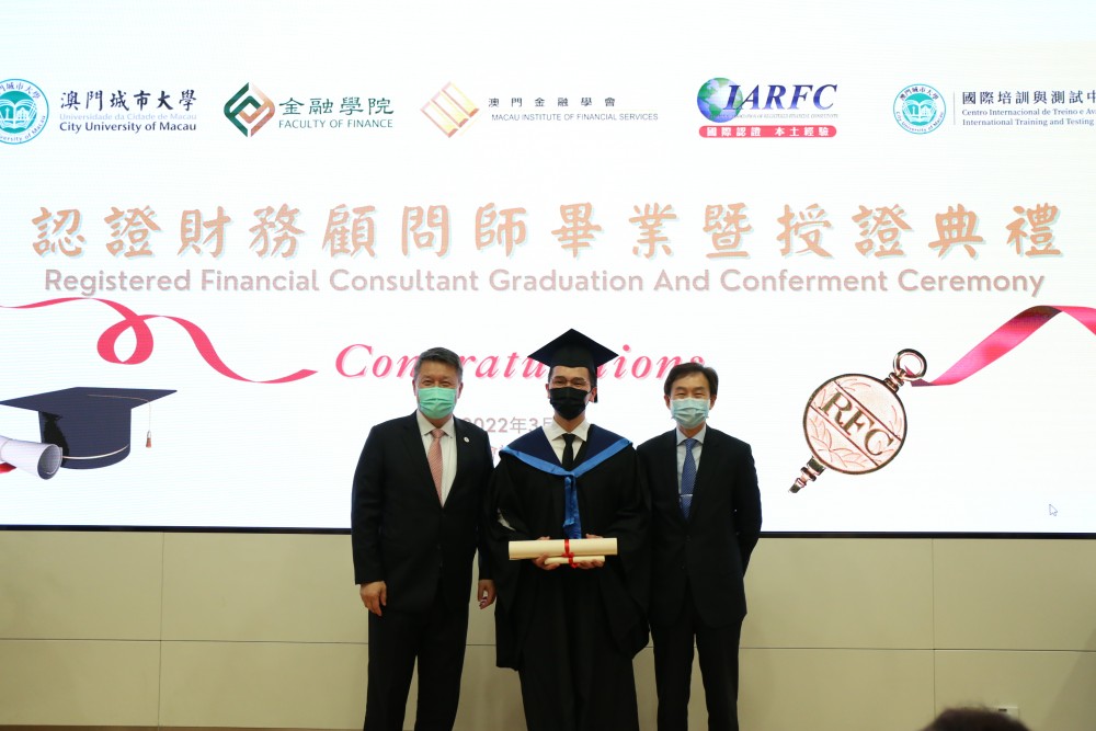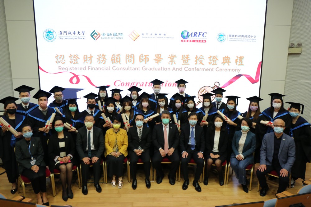 The Graduation and Conferment Ceremony of Registered Financial Consultant Certificate Program 2021 was successfully held at the Ho Yin Convention Centre of the City University of Macau (CityU Macau). Prof Jun Liu, Rector of CityU Macau, and Mr Raymond Chan, Vice Chairman of the Executive Board of the Macau Institute of Financial Services, attended the ceremony and conferred the Professional Certificate in Financial Consulting to the graduates.