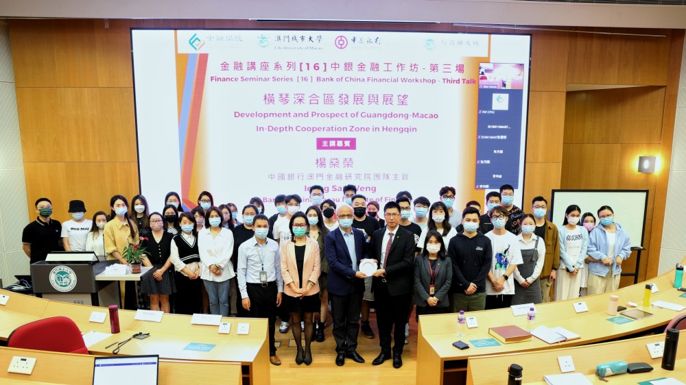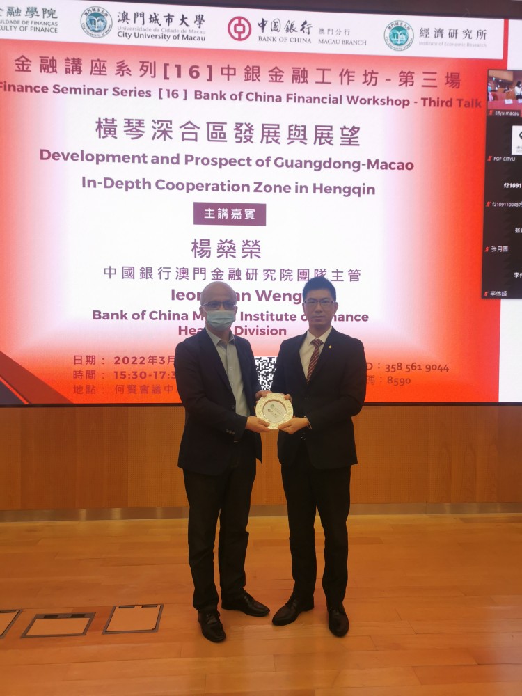 On 17 March 2022, the Faculty of Finance of the City University of Macau held the Finance Seminar Series [16], Bank of China Financial Workshop – Third Talk, at the Ho Yin Convention Centre. Mr Ieong San Wen, Head of Division of Bank of China Macau Institute of Finance, was invited to deliver speech titled “Development and Prospect of Guangdong Macao In-Depth Cooperation Zone in Hengqin”. Guests attending this seminar include Ms. Ho Soi In, Product Manager of the Integrated Marketing Division and Personal Banking and Channel Management Department, Dean Cheung Wai Kong, Associate Dean Eva Khong, and Course Coordinator of BAE Programme Lin Deqin of the Faculty of Finance, City University of Macau.