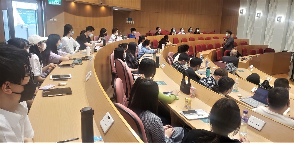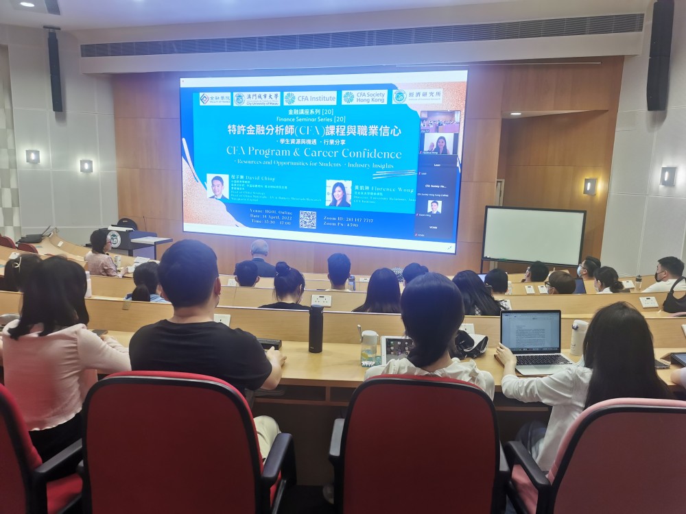 On 14 April 2022, the Faculty of Finance of the City University of Macau held the Finance Seminar Series [20], at the Ho Yin Convention Centre. Mr David Ching, Director of CFA, Head of China Strategy and Head of China Materials / EV & Battery Materials Research, Macquarie Capital, and Ms Florence Wong, Director of University Relations for Asia Pacific, CFA Institute, were invited to deliver online speeches on the industry insights and resources and opportunities for students, respectively. Guests attending this seminar include Dean Adrian Cheung; Associate Dean Eva Khong; Associate Professor Zefu Wu, Course Coordinator of Graduate Program; Assistant Professor Deqin Lin, Course Coordinator of BAE Program of Faculty of Finance, City University of Macau.