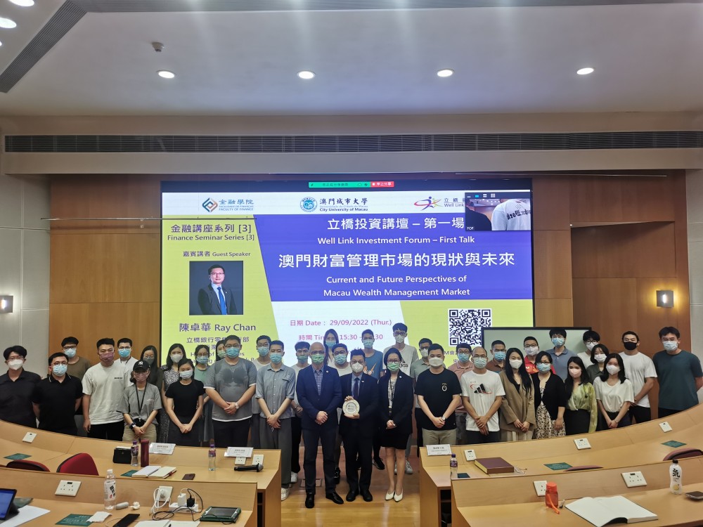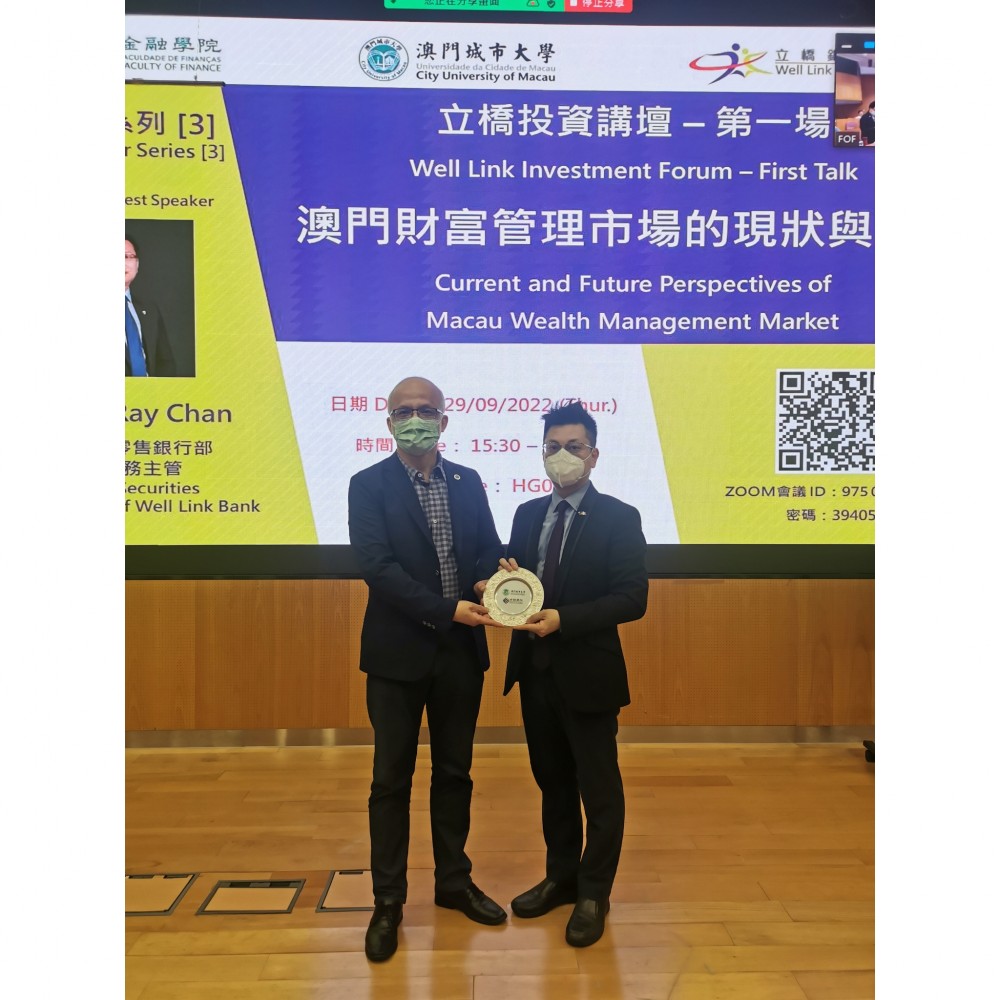 On 29 September 2022, the Faculty of Finance of the City University of Macao held the Finance Seminar Series [3] Well Link Investment Forum – First Talk at the Ho Yin Convention Centre. Mr. Ray Chan, Head of Securities & Nova Taipa Branch President, Retail Banking of Well Link Bank, was invited to deliver a speech titled “Current and Future Perspectives of Macau Wealth Management Market”. Guests attending this seminar include Dean Adrian Cheung and Associate Dean Eva Khong, City University of Macao.