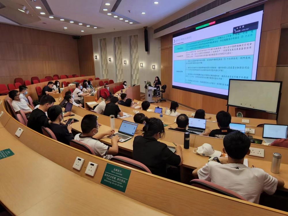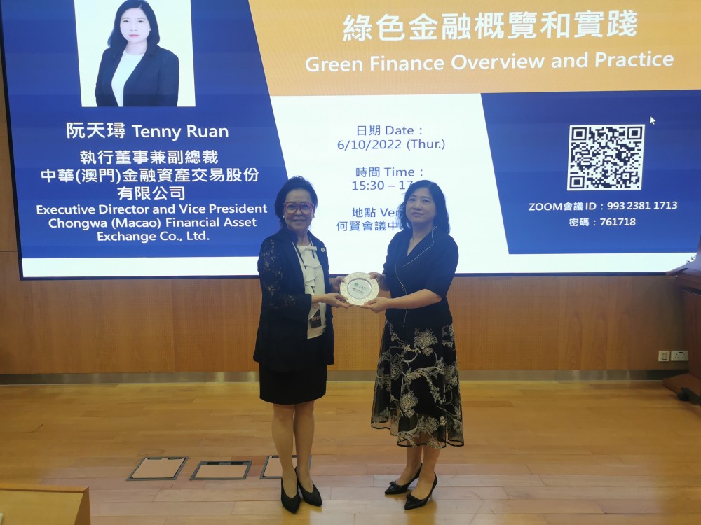 On 6 October 2022, the Faculty of Finance of the City University of Macao held the Finance Seminar Series [4] at the Ho Yin Convention Centre. Ms Tenny Ruan, Executive Director and Vice President of Chongwa (Macao) Financial Asset Exchange Co., Ltd., was invited to deliver a speech titled “Green Finance Overview and Practice”. Guests attending this seminar include Associate Dean Eva Khong, City University of Macao.