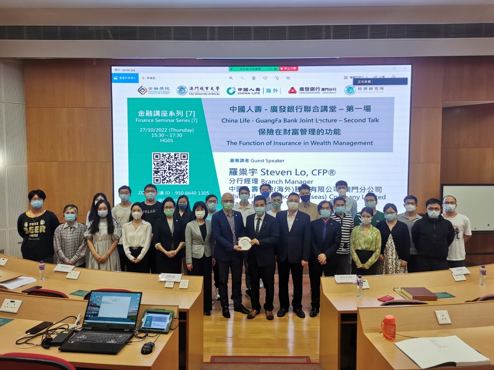 On 27 October 2022, the Faculty of Finance of the City University of Macao held the Finance Seminar Series [7] China Life – GuangFa Bank Joint Lecture – Second Talk at the Ho Yin Convention Centre. Mr Steven Lo, Branch Manager of China Life Insurance (Overseas) Company Limited Macau Branch, was invited to deliver a speech titled “The Function of Insurance in Wealth Management”. Guests attending this seminar include Ms Jin Ling, Head of the Comprehensive Management Department, Mr Paul Chan, Head of the Personal Agent Department and Mr Chaohui Jin, Senior Branch Manager, China Life Insurance (Overseas) Company Limited Macau Branch; Dean Adrian Cheung and Associate Dean Eva Khong, City University of Macao.