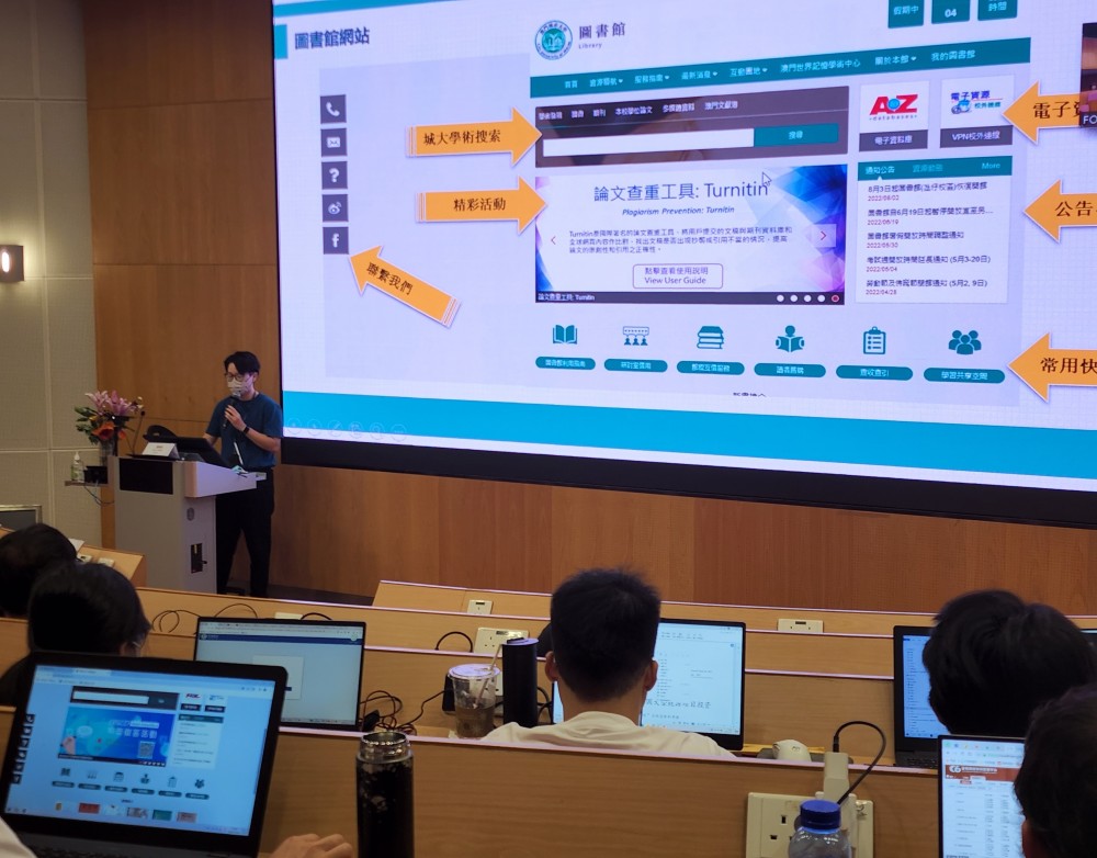Ms. Ka Wun Cheang stated that according to the Faculty and curriculum settings, the subject librarians go deep into the Faculty and embed the courses, and the library provides literature resources that guarantee services for teaching and scientific search, helping students to use the services of the university library and other online resources more conveniently, and obtain relevant resources more easily and quickly to help their studies, thesis research and writing. Ms Cheang shared with students all the steps and explained how to use the library website, including the academic search toolbar, electronic database, announcements and resource updates, and multiple quick access points of the university library website. Students could check the borrowing status of books on the site at any time. Ms Cheang also introduced the PrimoVE one-stop academic discovery platform, which can be used to search physical collections and electronic resources. Lastly, Ms Cheang recommended a number of Chinese and English electronic resources to the students, including CNKI(China National Knowledge Infrastructure) and Wanfang Data Knowledge Service Platform.