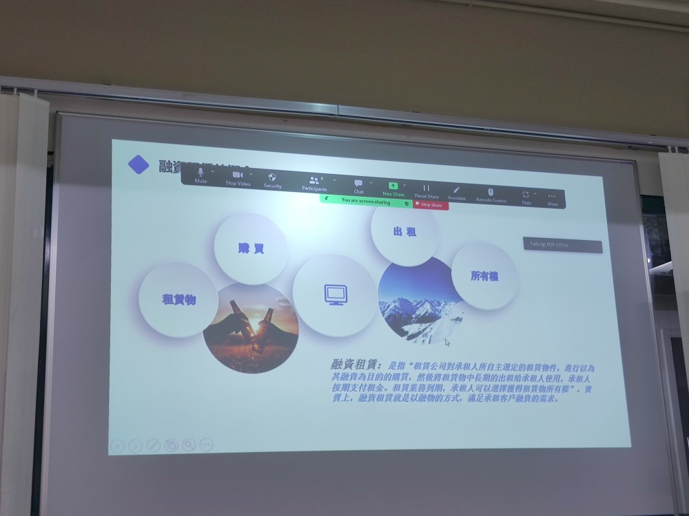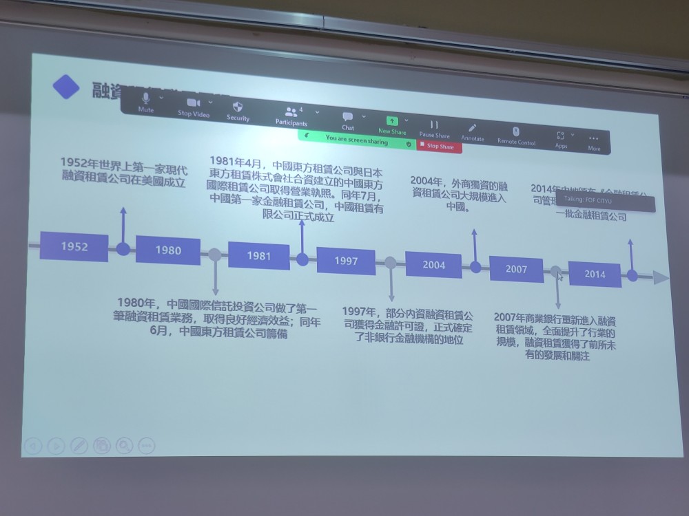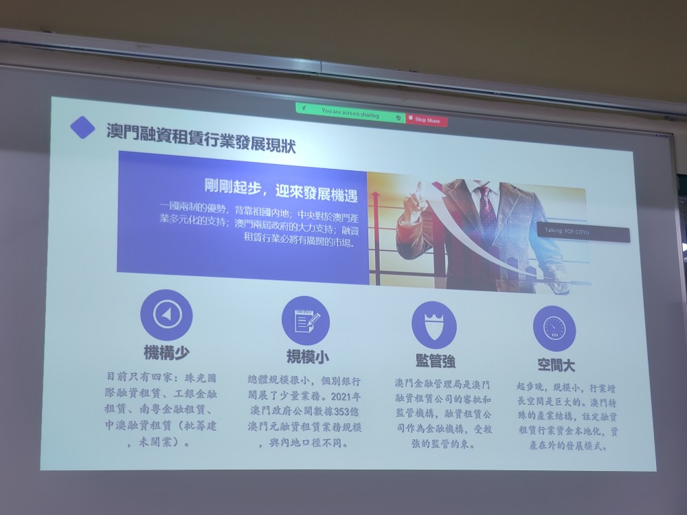 Lastly, Mr Lok introduced Zhuguang (Macao) International Financial Leasing Co., Ltd. To the students. Zhuguang (Macao) International Financial Leasing Co., Ltd. is the first and only financial leasing company in Macao. Looking forward to the future, Zhuguang (Macao) Leasing will have the advantage of dual licenses in Macao and Zhuhai. On the one hand, it will give full play to the role of Macao as a window to connect with Portuguese-speaking countries and attract overseas low-cost funds. On the other hand, it will closely follow the construction plans of Guangdong-Hong Kong-Macao Greater Bay Area and Hengqin Guangdong-Macao In-depth Cooperation Zone, and strive to build a high-quality international financial leasing company with industry focus and deep development in the Bay Area.