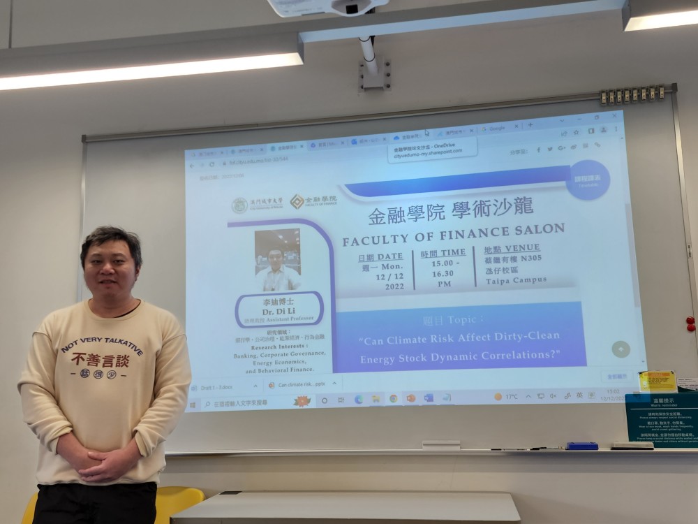 In order to further help the faculty and students of Faculty of Finance, City University of Macau, to explore research issues and share research experiences, the fourth Finance Salon was held. The keynote speaker is Dr. Di Li, Assistant Professor of Faculty of Finance.