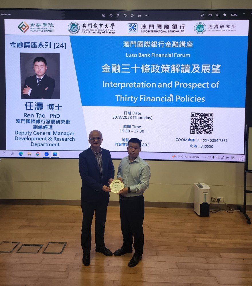 On 30 March 2023, the Faculty of Finance of the City University of Macau held the Finance Seminar Series [24] Luso Bank Financial Forum at the Ho Yin Convention Centre. Dr. Tao Ren, Research Associate of the National Institution for Finance & Development and Deputy General Manager of Development Research Department of Luso International Banking Ltd., was invited to deliver a speech titled “Interpretation and Prospect of Thirty Financial Policies”. Guests attending this seminar include Dean Adrian Cheung and Associate Dean Eva Khong of Faculty of Finance, City University of Macau.