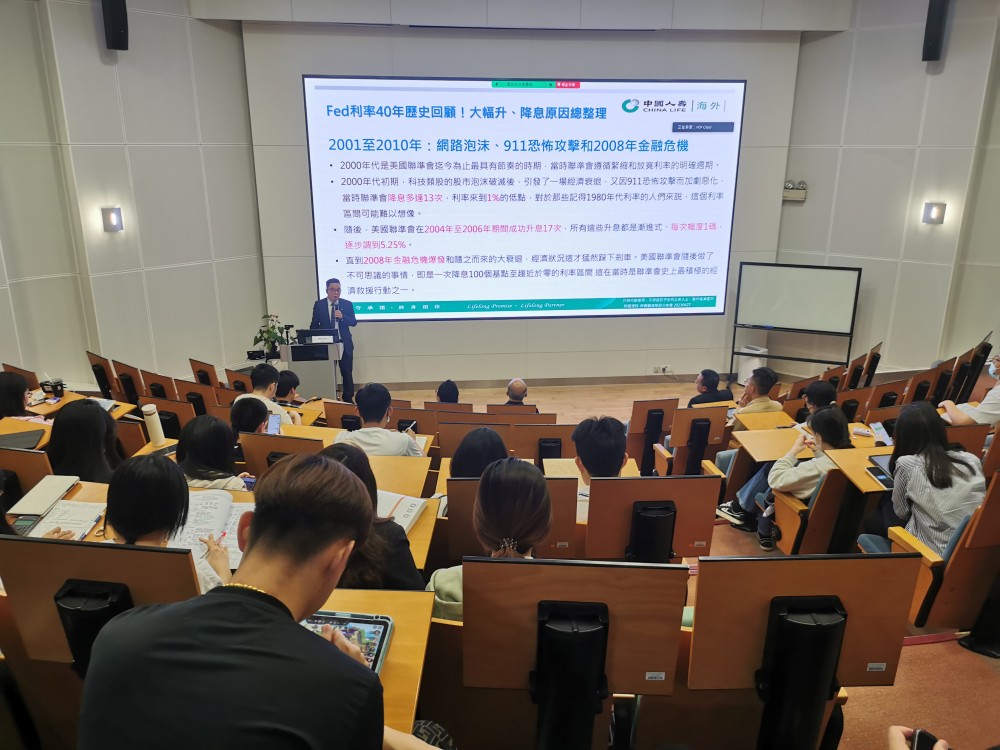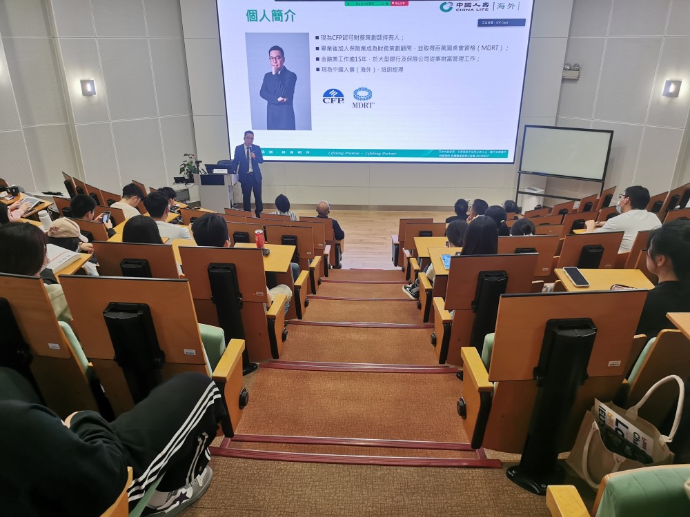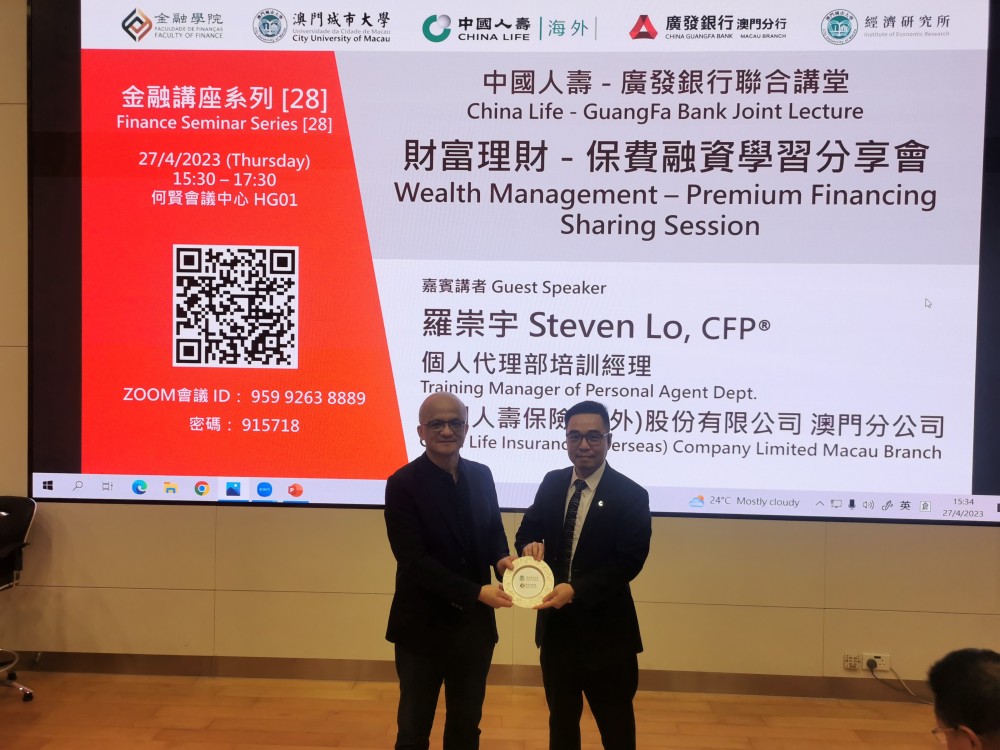 On 27 April 2023, the Faculty of Finance of the City University of Macau held the Finance Seminar Series [28] China Life – GuangFa Bank Joint Lecture at the Ho Yin Convention Centre. Mr. Steven Lo, Training Manager of Personal Agent Department of China Life Insurance (Overseas) Company Limited Macau Branch, was invited to deliver a speech titled “Wealth Management – Premium Financing Sharing Session”. Guests attending this seminar include Mr. Paul Chan, Head of the Personal Agent Department and Mr. Chaohui Jin, Senior Branch Manager, China Life Insurance (Overseas) Company Limited Macau Branch; Dean Adrian Cheung and Associate Dean Eva Khong of Faculty of Finance, City University of Macau.