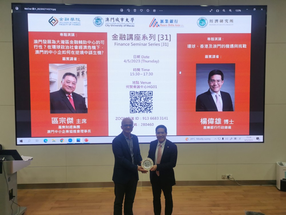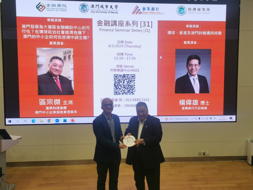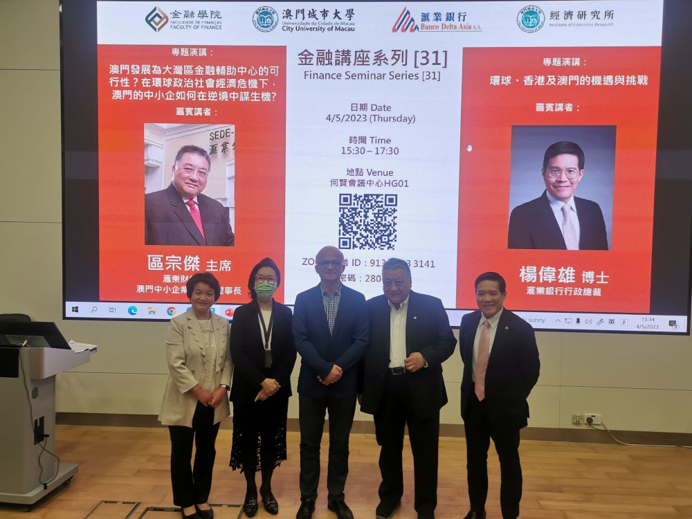 On 4 May 2023, the Faculty of Finance of the City University of Macau held the Finance Seminar Series [31] at the Ho Yin Convention Centre. Mr. Stanley Au, Chairman of Delta Asia Financial Group, and the Founder and Chairman of The Small and Medium Enterprises Association of Macao and Delta Asia SME Training Institute, and Dr. Paris Yeung, Chief Executive Officer of Banco Delta Asia S.A., were invited to deliver “The prospects and potentials of Macau being transformed into a supplementary financial centre in the Greater Bay Area? How the Macau SMEs can survive and find their niche markets and blue ocean amid the current geopolitical, social, and economic crisis?” and “Opportunities and Challenges for Global, Hong Kong and Macau”, respectively. Guests attending this seminar include Ms. May Lok of Banco Delta Asia S.A.; Dean Adrian Cheung and Associate Dean Eva Khong, City University of Macau.