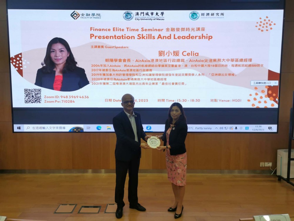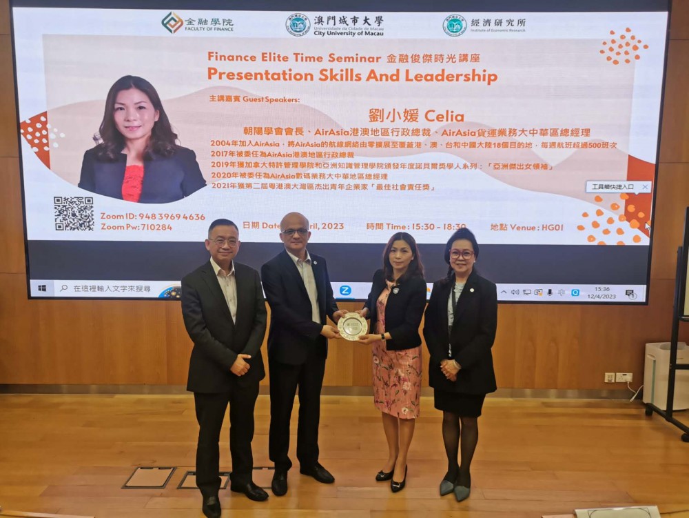 The Faculty of Finance held “Finance Elite Time” Seminar (in English) in the afternoon of 12 April 2023. Ms. Celia Lao, Chairman of Macau Sunrise Academic Association, CEO of AirAsia Hong Kong & Macau, and General Manager of China, AirAsia Digital & Cargo, was invited to deliver a speech titled “Presentation Skills and Leadership”. Students in the BAE Finance Elite Cohort of all four grades participated in the event. Chairman of Macau Asset Management Association and Honorary Chairman of Macau Sunrise Academic Association, Dr. John Chu, Dean Adrian Cheung, Associate Dean Eva Khong and Lecturer Simon Sou of Faculty of Finance also attended the seminar.
