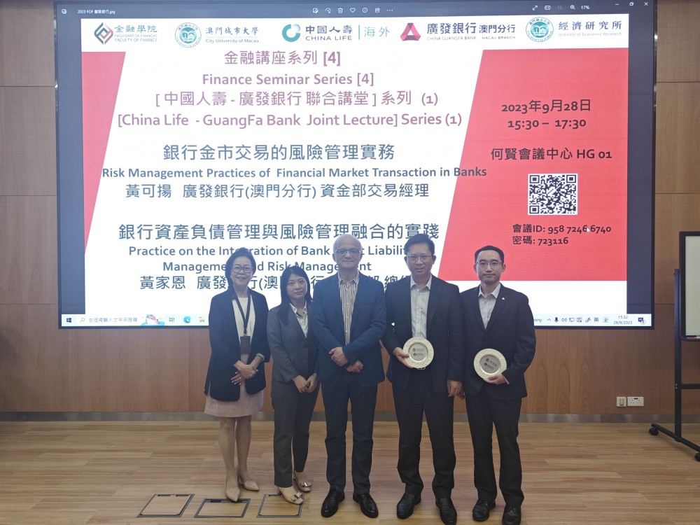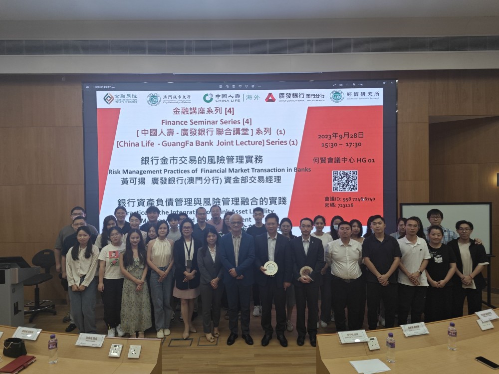 On September 28, 2023, the School of Finance at the City University of Macau hosted the China Life-Guangfa Bank Joint Lecture Series (1) at the He Xian Conference Center. The guest speakers for this lecture were Mr. Huang Keyang, Trading Manager of the Treasury Department at Guangfa Bank Macau Branch, and Mr. Huang Jia'en, General Manager of the branch. They shared their expertise on the topics of "Risk Management Practices in Bank Treasury Trading" and "Integration of Bank Asset Liability Management and Risk Management Practices." Other attendees included Mr. Lin Baoguo, Deputy General Manager of the Corporate Banking Department at Guangfa Bank Macau Branch, and Dean Adrian Cheung and Associate Dean Eva Khong of Faculty of Finance, City University of Macau.