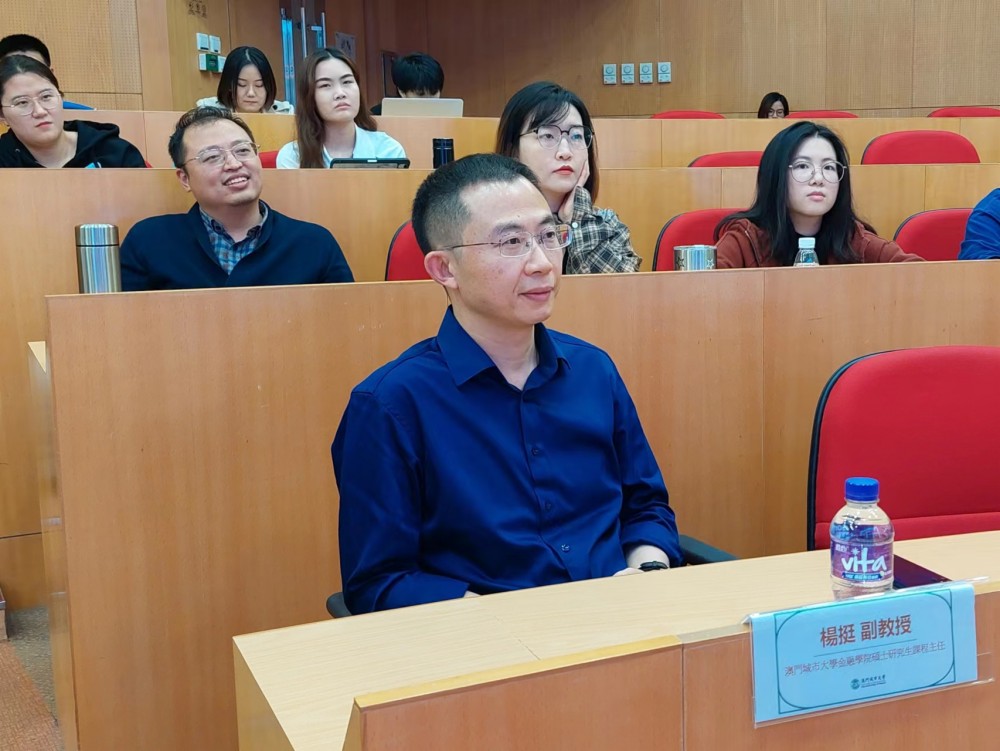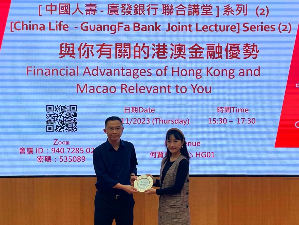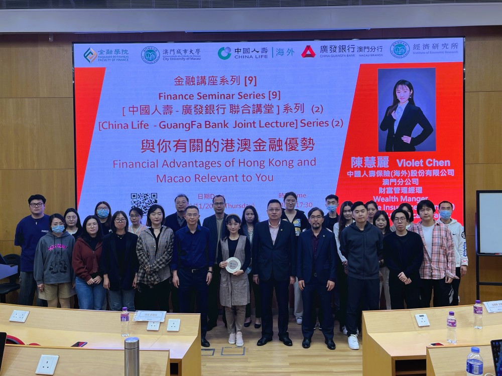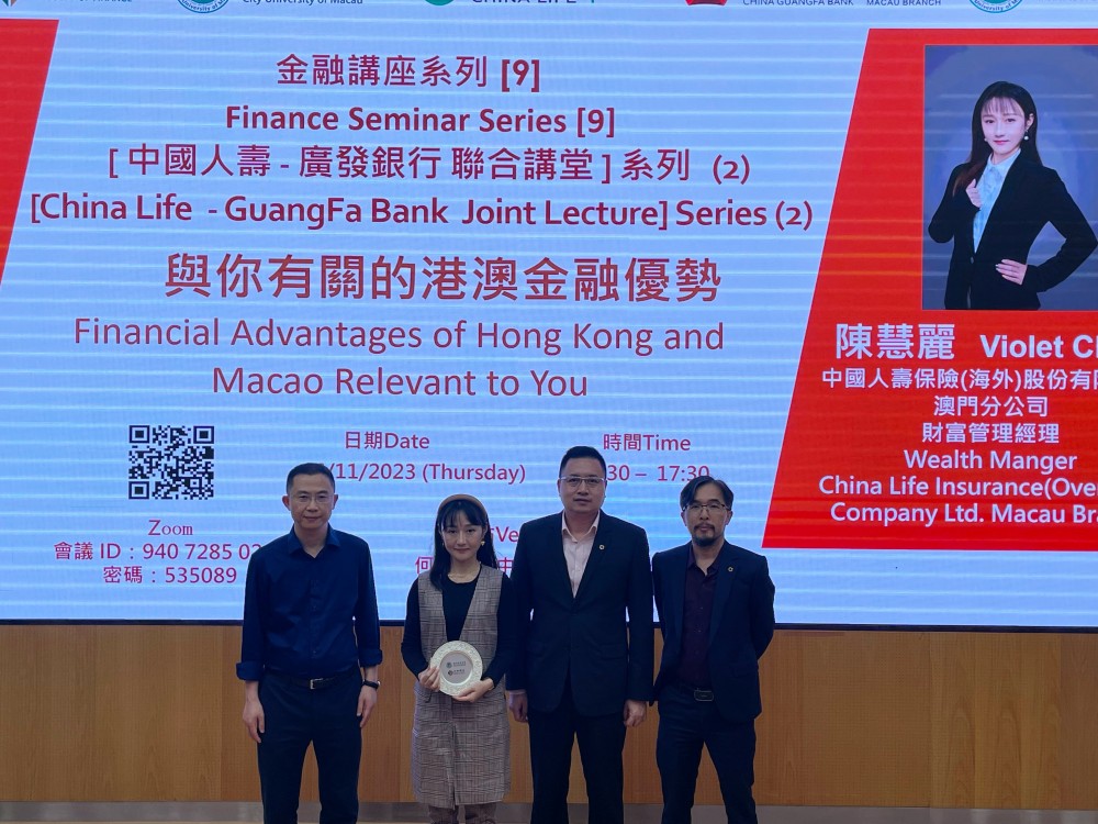 On November 16, 2023, the Faculty of Finance at the City University of Macau organized the Finance Seminar Series [9], China Life - GuangFa Bank Joint Lecture – Second Talk at the Ho Yin Convention Center. The seminar titled " Financial Advantages of Hong Kong and Macao Relevant to You" featured Ms. Huili Chen, Wealth Manager at China Life Insurance (Overseas) Company Ltd., Macau Branch as the guest speaker. She shared her analysis and insights on trends in the insurance industry. Guests attending this seminar include Mr. Chaohui Jin, Manager, China Life Insurance (Overseas) Company Ltd., Macau Branch, Mr. Paul Chan, Head of the Individual Agency Department at China Life Insurance (Overseas) Company Ltd., Macau Branch, and Associate Professor and Dr. Yang Ting, Course Coordinator of Master's Degree Programme, from Faculty of Finance, City University of Macau.