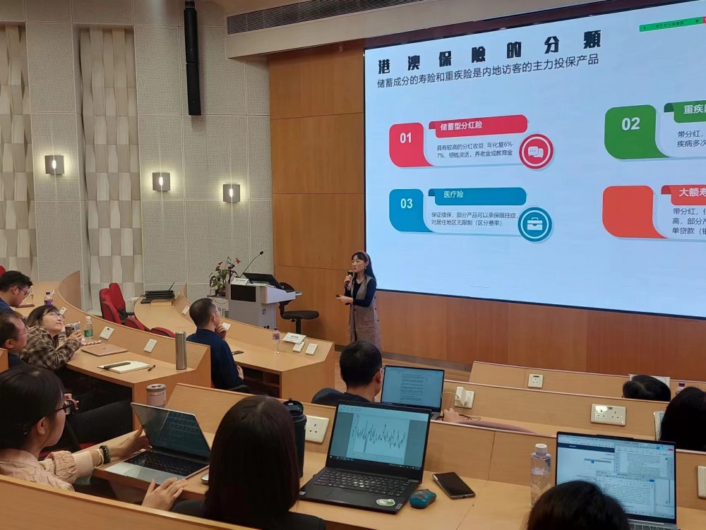 Ms. Chen, also briefly explained the characteristics of insurance in Hong Kong and Macau, introducing the main features of savings-based participating policies, critical illness insurance, medical insurance, and high-value life insurance products. She pointed out that life insurance and critical illness insurance with savings components are the main products that mainland customers prefer to purchase. She also shared tips with the students on how to develop good work habits and leverage the advantages of Hong Kong and Macau. For example, continuously providing financial and lifestyle information on social media platforms to strengthen interaction with clients and explore multiple sources of customers.