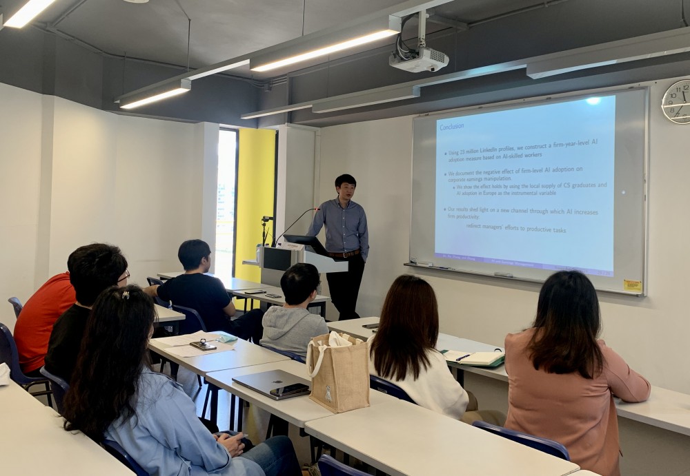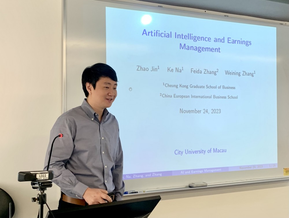 The Faculty of Finance at the City University of Macau held the sixth academic salon (2023-2024) on November 24, 2023, at the Taipa Campus in Room L311. The seminar was conducted by Dr. Jin Zhao from the Cheung Kong Graduate School of Business. Dr. Jin Zhao delivered a lecture on his research paper titled "Adoption of Artificial Intelligence and Earnings Management," which explores the impact of the adoption of artificial intelligence (AI) on corporate earnings management. The paper showed that companies with a higher adoption rate of artificial intelligence are less likely to have financial reporting errors related to fraud. This research highlights the role of artificial intelligence in shaping corporate financial reporting.