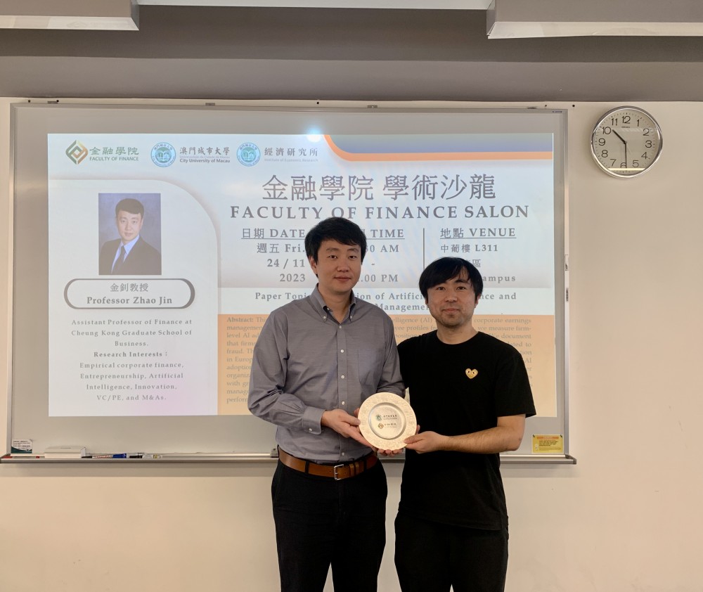 Dr. Jin Zhao obtained his Ph.D. in Finance from the Simon Business School at the University of Rochester. His research interests include entrepreneurship, artificial intelligence, venture capital, and mergers and acquisitions. His research on artificial intelligence has been published in a top-ranked finance journal, the Journal of Finance, and has been reported by The New York Times, The Wall Street Journal, and Tencent News. During this academic salon, Dr. Jin Zhao shared his latest research findings with professors and students of the Faculty of Finance, City University of Macau, contributing to the advancement of academic development in the Faculty of Finance.