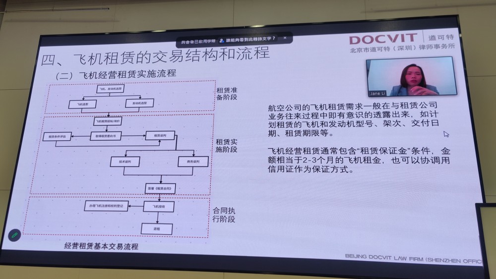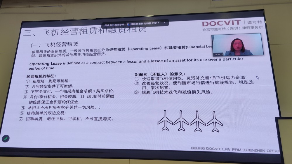 Next, Jane Li explained the various methods of aircraft leasing, providing detailed classifications based on nature, scope, financing sources, and payment themes. There are multiple financing channels available for aircraft leasing, with secured and unsecured loans being the primary sources. Based on the operational nature of the lease, aircraft leasing is generally categorized into operating leases and financial leases. Operating leases are relatively straightforward and usually include a "lease deposit" condition, typically equivalent to 2-3 months of aircraft rent, with the option to employ a letter of credit as well. On the other hand, aircraft financial leasing serves both financing and physical leasing purposes. Its most distinctive feature is that the lease term aligns with the aircraft's operational period, with the lessor bearing all costs and risks associated with the aircraft during the lease term, while legal ownership of the aircraft remains with the lessor, and the lessee holds the economic rights of use. Aircraft financial leasing effectively transfers all risks and returns related to the leased asset to the lessee.