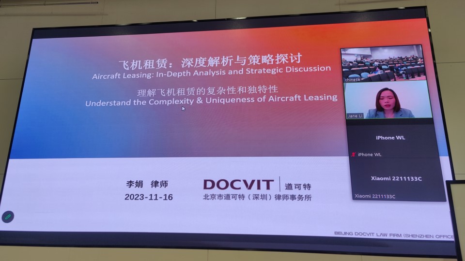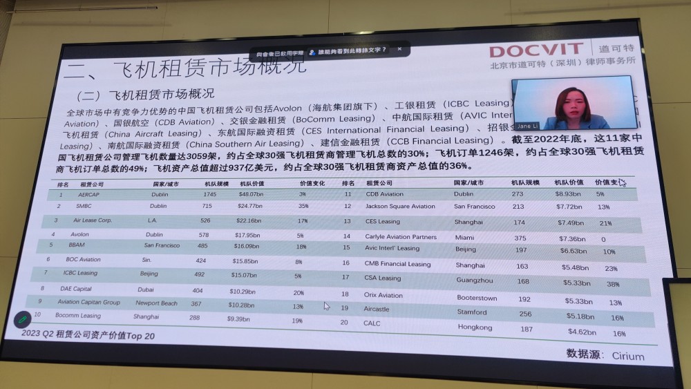 Jane Li, as the first part of her presentation, introduced the concept, definition, and historical development of aircraft leasing. She emphasized the broad scope, large investment amounts, and long transaction cycles involved in aircraft leasing, explaining the functional characteristics of aircraft leasing from both macroeconomic and microeconomic perspectives. Despite the significant impact of the previous years' pandemic, the aircraft leasing market has exhibited robust and steady growth globally, with increasing demand and a particular focus on the future market needs in Southeast Asia, especially in the Chinese region.