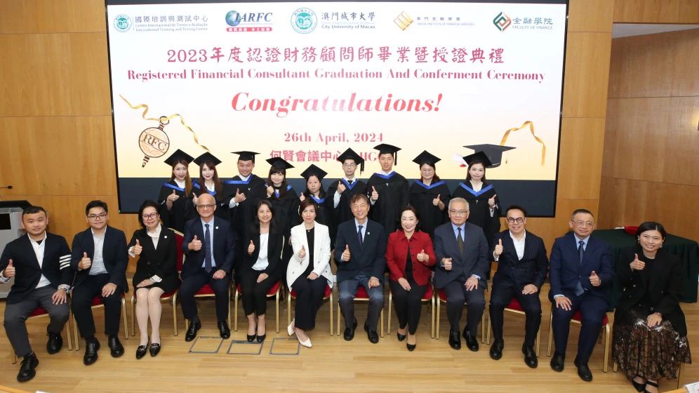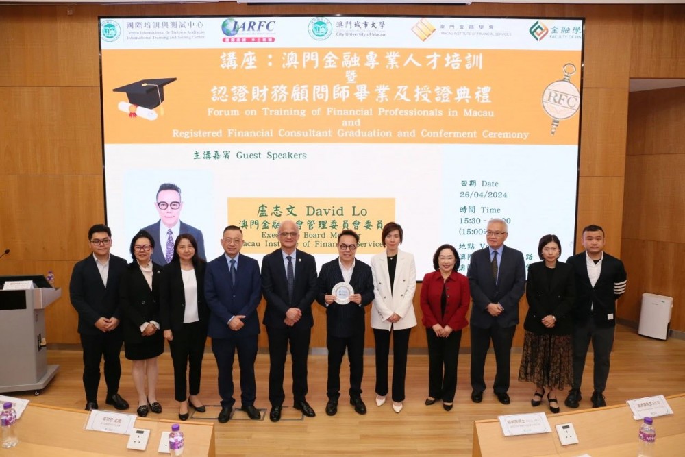 The City University of Macau recently hosted the “Forum on Training of Financial Professionals in Macau and Registered Financial Consultant Graduation and Conferment Ceremony” at the Ho Yin Convention Centre, Taipa Campus. The graduation ceremony honored 11 students from leading international insurance companies who completed the “Professional Certificate in Financial Consulting” (Executive Program 2023) and were conferred the qualifications of both "Professional Certificate in Financial Consulting" and “Registered Financial Consultant.” This Executive Program was co-organized by the Faculty of Finance and the International Training and Testing Center in collaboration with the Macau Institute of Financial Services and the International Association of Registered Financial Consultants (IARFC). Leaders and representatives attended the ceremony and delivered speeches to commend the learning accomplishments of the graduating students. Lo Chi Man, a member of the Executive Board of the Macau Institute of Financial Services, hosted the forum and shared insightful analyses on current trends in the financial market, the impact of artificial intelligence on the industry, and the growing popularity of short-term contracts or freelance work. Drawing from his personal experience, Lo encouraged students to continue developing their professionalism.