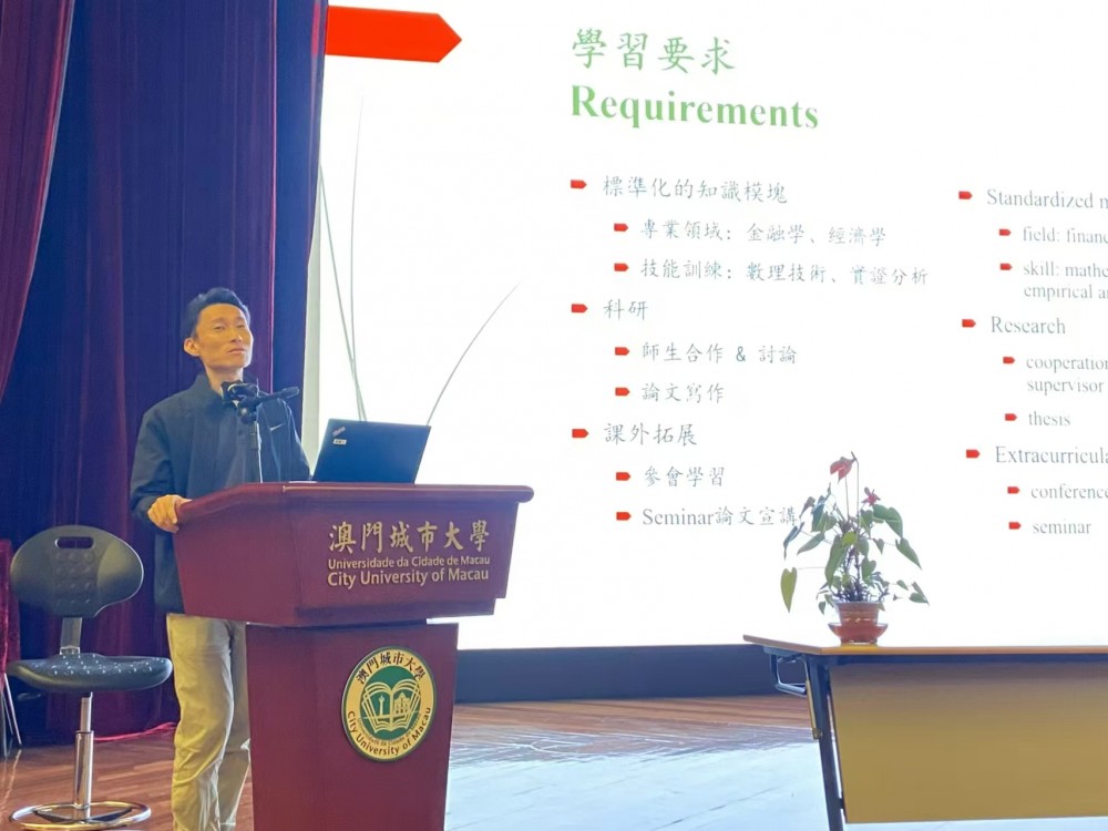 Next, Professor Zhou, course coordinator of PhD program, provided a detailed introduction to the PhD program in Finance, including the credit requirements and thesis publication criteria. He encouraged students to actively participate in academic seminars organized by the faculty to enhance their learning experience, stay informed about industry trends and master mainstream analytical methods and skills. Professor Zhou also advised the new students to focus on academic research, emphasizing the importance of extensive reading and the effective use of professional tools and methodologies.