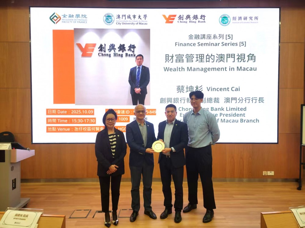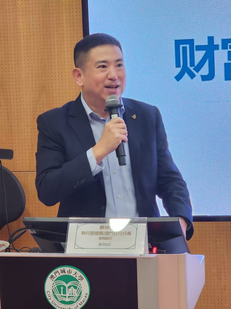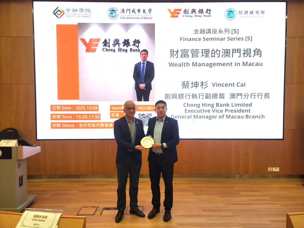 On October 9, 2025, the Faculty of Finance of City University of Macau held a finance seminar at Ho Yin Conference Center on Taipa Campus. The seminar featured Mr. Vincent Cai, Executive Vice President, General Manager of Macau Branch, was invited as the keynote speaker. The seminar focused on the theme " Wealth Management in Macau." Distinguished guests included Dean Adrian Cheung and Associate Dean Eva Khong of the Faculty of Finance.
