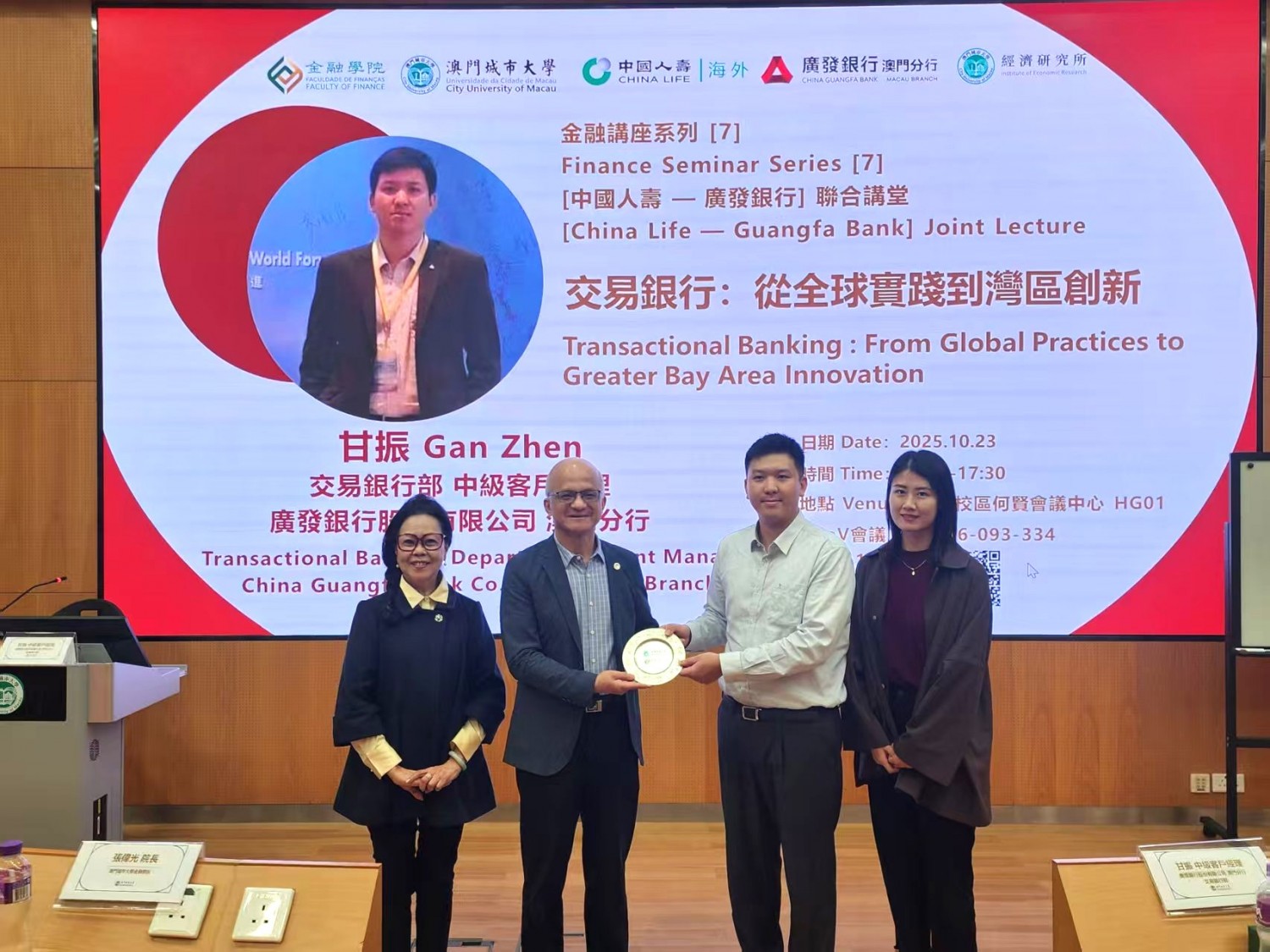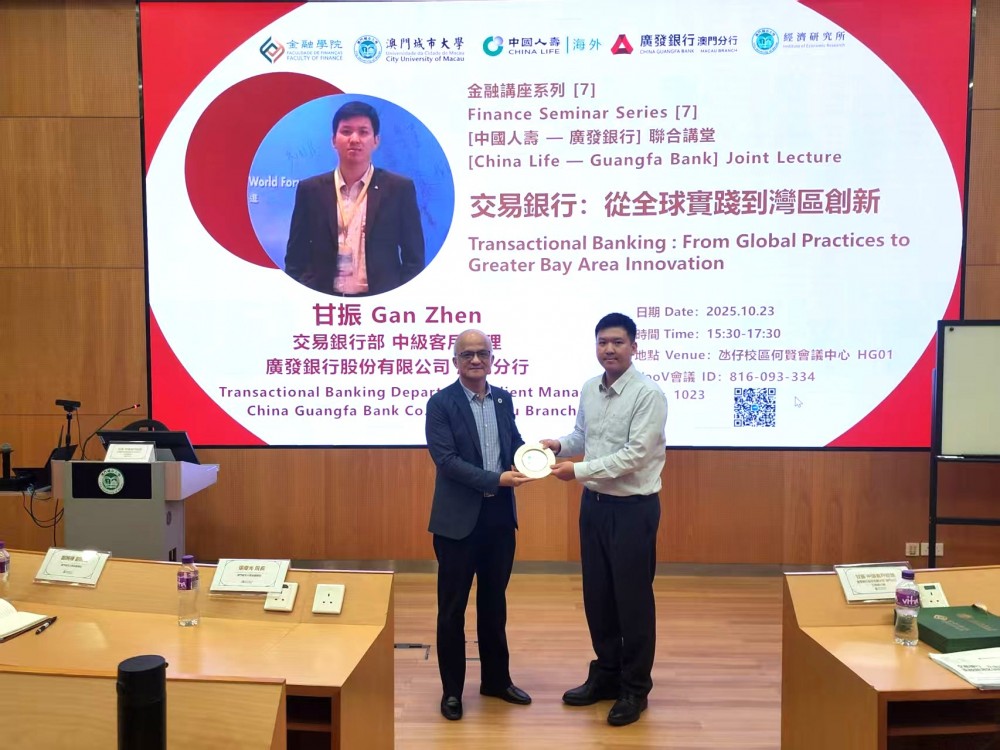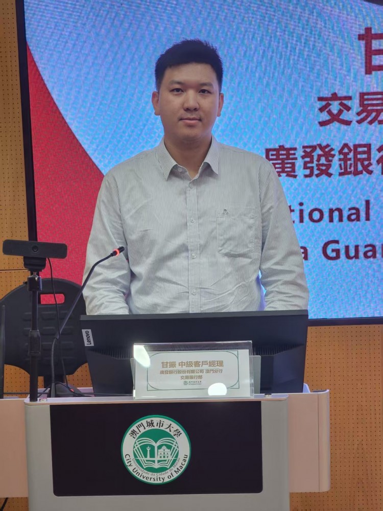 On 23rd October 2025, the Faculty of Finance of City University of Macau held a finance seminar, China Life—Guangfa Bank Joint Lecture at Ho Yin Conference Center in Taipa Campus. The seminar featured Mr. Gan Zhen, Senior Client Manager of Transactional Banking Department at China Guangfa Bank Co., Ltd. Macau Branch, was invited as the keynote speaker. The seminar focused on the theme: “Transactional Banking : From Global Practices to Greater Bay Area Innovation.” Distinguished guests included Ms. Li Mengqing, Senior Client Manager of Transactional Banking Department at China Guangfa Bank Co., Ltd. Macau Branch, as well as Dean Adrian Cheung and Associate Dean Eva Khong of the Faculty of Finance.