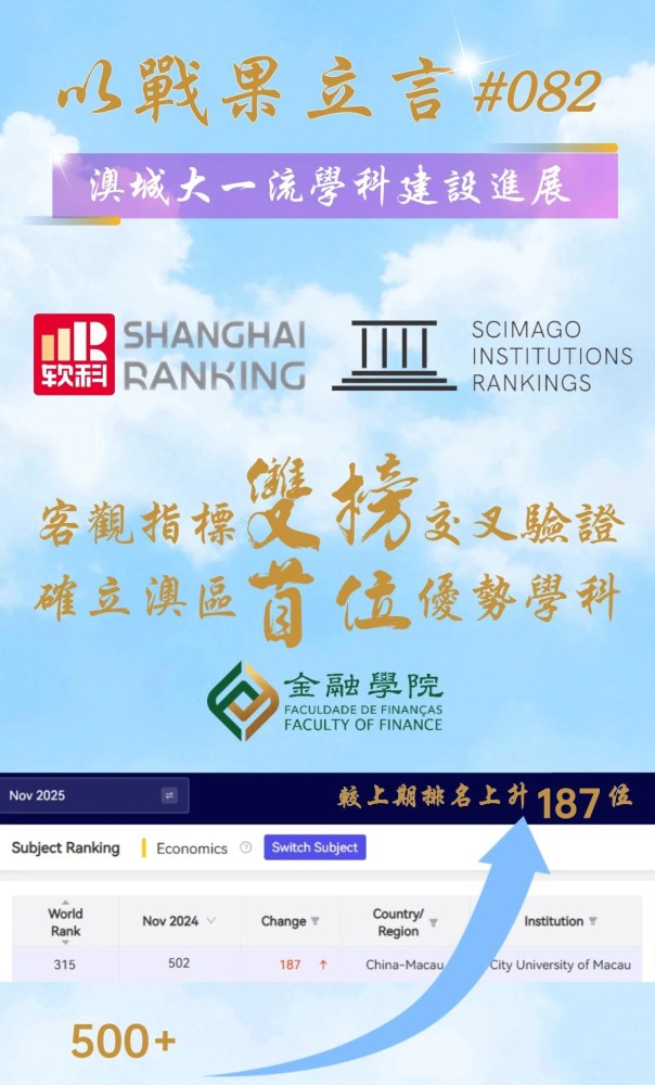 The Faculty of Finance(FOF) of City University of Macau (CityU of Macau) has gained international recognition for its academic standards, with its Economics discipline breaking into the global top 300 for the first time and ranking first in Macao in the 2025 "Global Ranking of Academic Subjects(GRAS)" released recently by ShanghaiRanking, an authoritative global higher education evaluation agency.