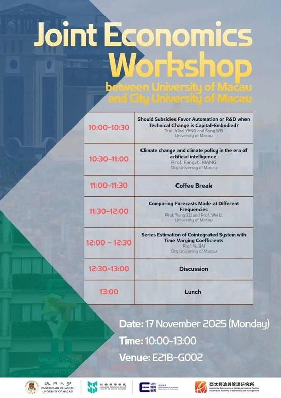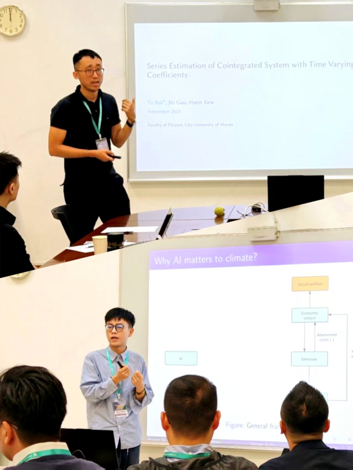 On November 17, 2025, the second joint economics workshop between the University of Macau and City University of Macau was successfully held at Department of Economics, the University of Macau. At the workshop, our faculty members Fangzhi Wang and Yu Bai presented their working papers titled "Climate Change and Climate Policy in the Era of Artificial Intelligence" and "Series Estimation of Cointegrated System with Time Varying Coefficients", respectively. Faculty member Yibai Yang and doctoral student Wei Song from the University of Macau reported on the paper "Should Subsidies Favor Automation or R&D when Technical Change is Capital-Embodied". Faculty members Yang Zu and Wei Li from the University of Macau reported the paper "Comparing Forecasts Made at Different Frequencies". The discussions during the conference were lively, promoting academic exchange in economics between the two universities. Attending from the University of Macau were also Department Head Angus C. Chu, Zaifu Yang, Jia Chen, Yubo Tao, Lawrence Choo, and other faculty members, along with graduate students. Our faculty participants included Yonghong Zhou, Weiping Li, Le Li, Junyi Hua, Lifei Xue, Xingxu Ma, Sheung-Chi Chow, Jingru Gao, and Xuezheng Chen.