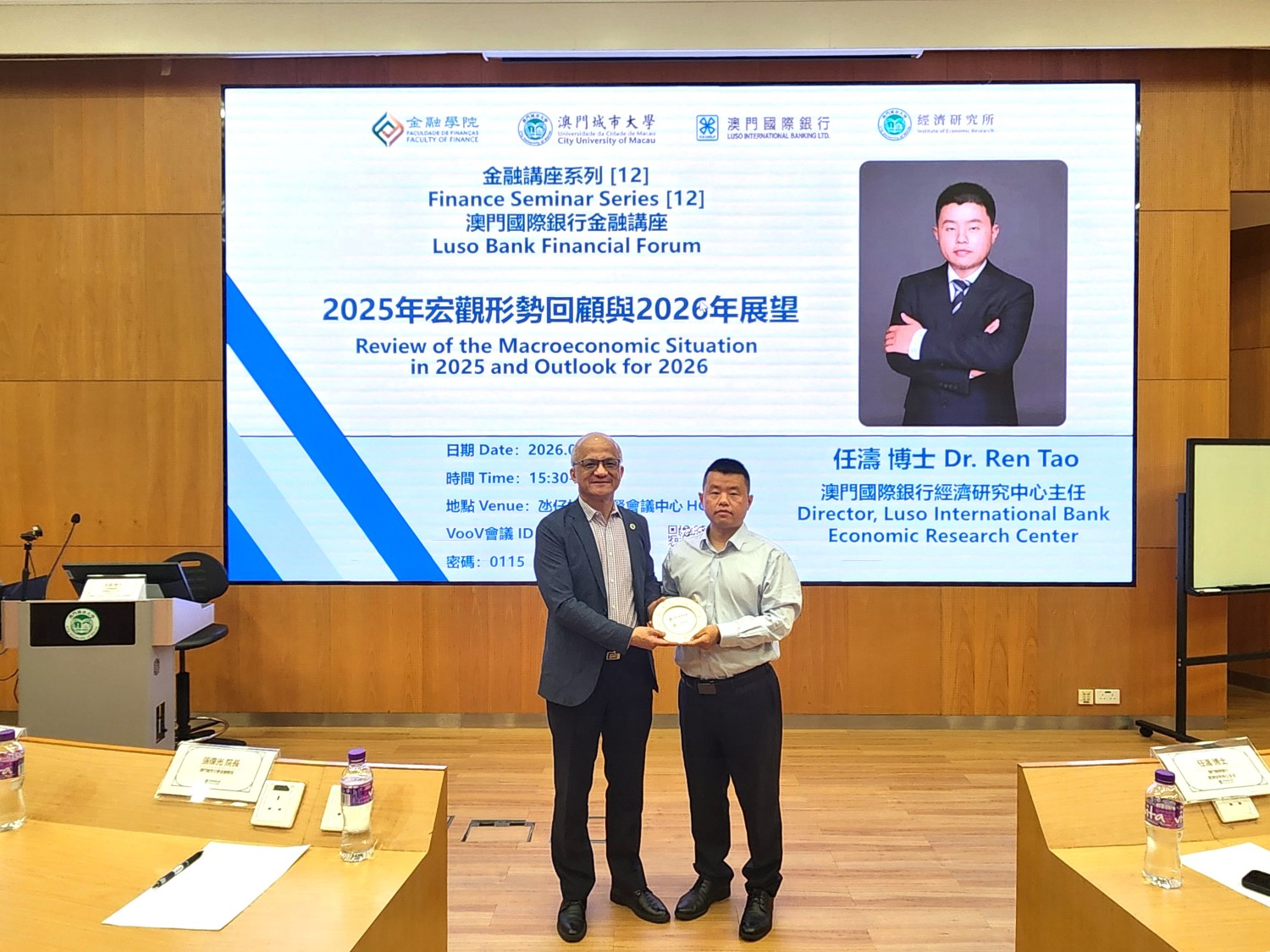 On 15th January 2026, the Faculty of Finance of City University of Macau held a finance seminar, Luso Bank Financial Forum at Ho Yin Conference Center in Taipa Campus. The seminar featured Dr. Ren Tao, Director of the Economic Research Center of Luso International Banking, was invited as the keynote speaker. The seminar focused on the theme: “Review of the Macroeconomic Situation in 2025 and Outlook for 2026.” Distinguished guests included Dean Adrian Cheung and Associate Dean Eva Khong of the Faculty of Finance.