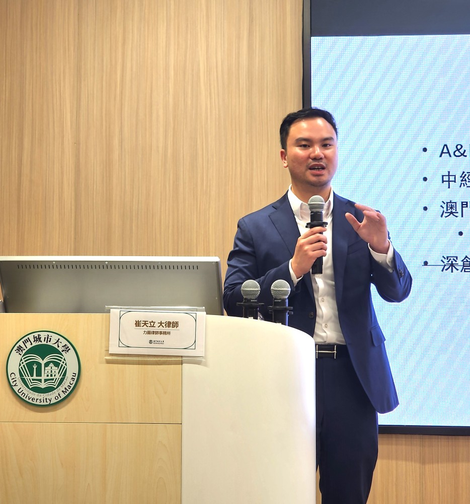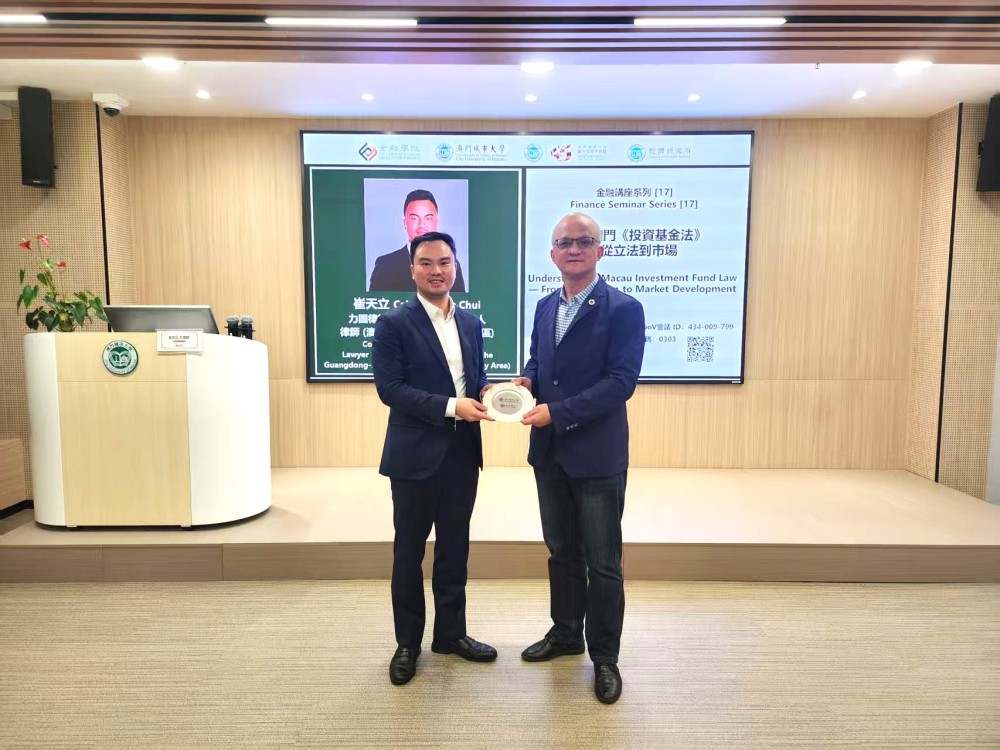 On March 3, 2026, the Faculty of Finance at City University of Macau held a finance seminar at Golden Dragon Campus, Macau. The seminar featured Mr. Calvin Tinlop Chui, Co-Managing Partner of Lektou Advogados e Notários, was invited as the keynote speaker. The seminar focused on the theme "Understanding Macau Investment Fund Law — From Legislation to Market Development." Distinguished guests included Dean Adrian Cheung and Associate Dean Eva Khong of the Faculty of Finance.